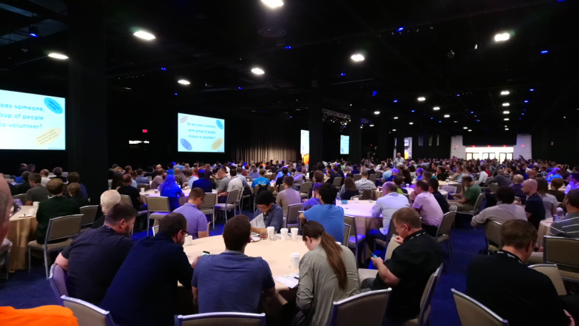 The main conference hall was packed to listen to Paul Ramsey talk about “Why We Code”