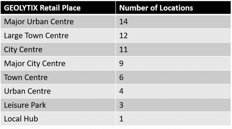 Creams Locations by GEOLYTIX Retail Place Type - December 2017