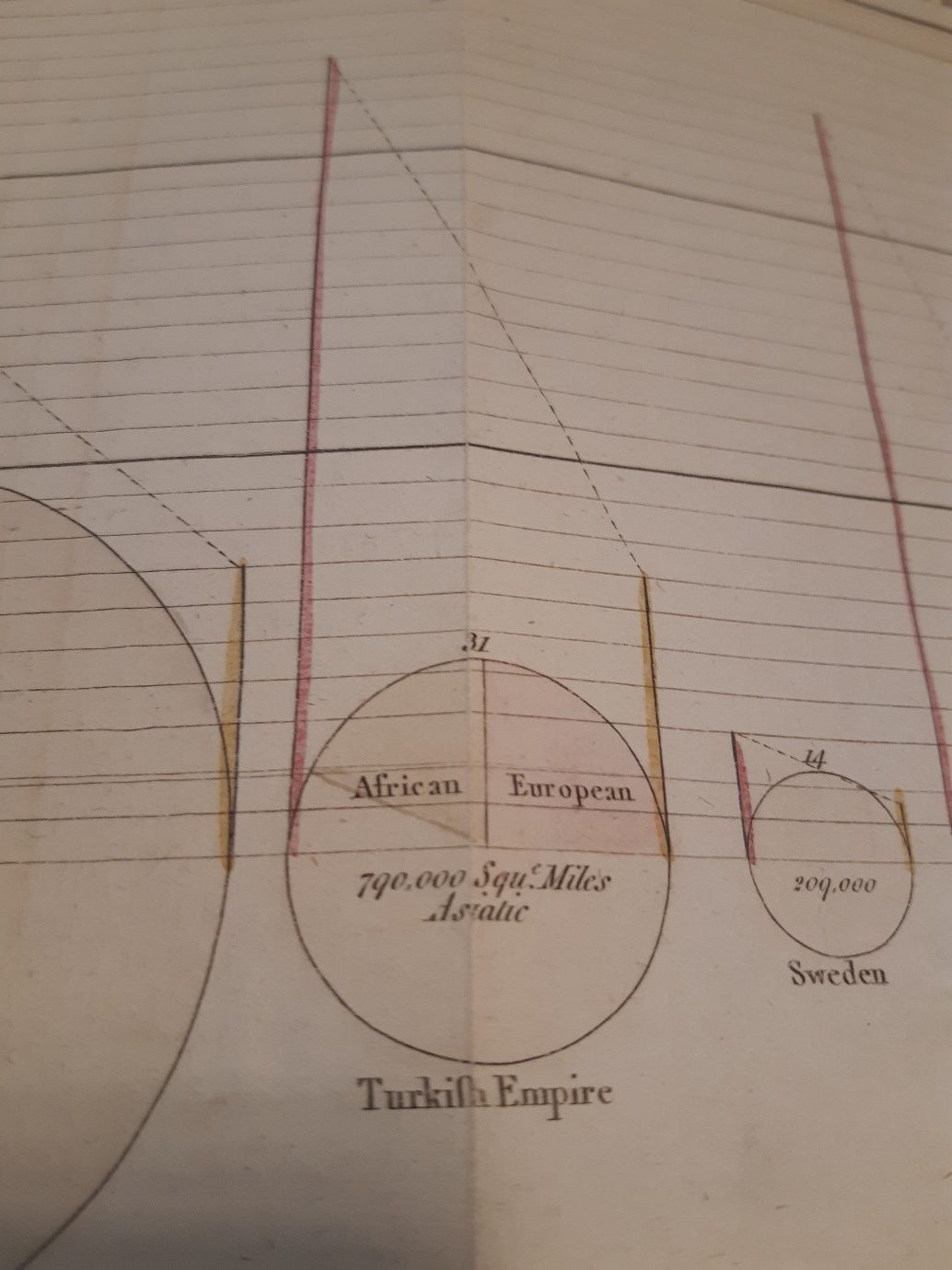 So how did he come up with them? What prompted this astonishing burst of creativity in the late 1700’s? William’s relentless pursuit of new ways to show dull old data are well documented. Line and bar charts both have antecedents, and their origins are well documented. But the pie chart? It came out of nowhere and has long baffled historians of statistical graphics. There are no clear proto-pie charts. Euler had created his diagrams, but the idea of a circle representing a value and carving it up into slices was entirely novel. This week I found myself in the British Library holding, inspecting, touching a first edition of William’s Statistical Breviary. This small book contains the fold out data visualisation within which we find the first pie-chart. I took the scan below. I now think I know how and why and how he came up with the pie-chart.