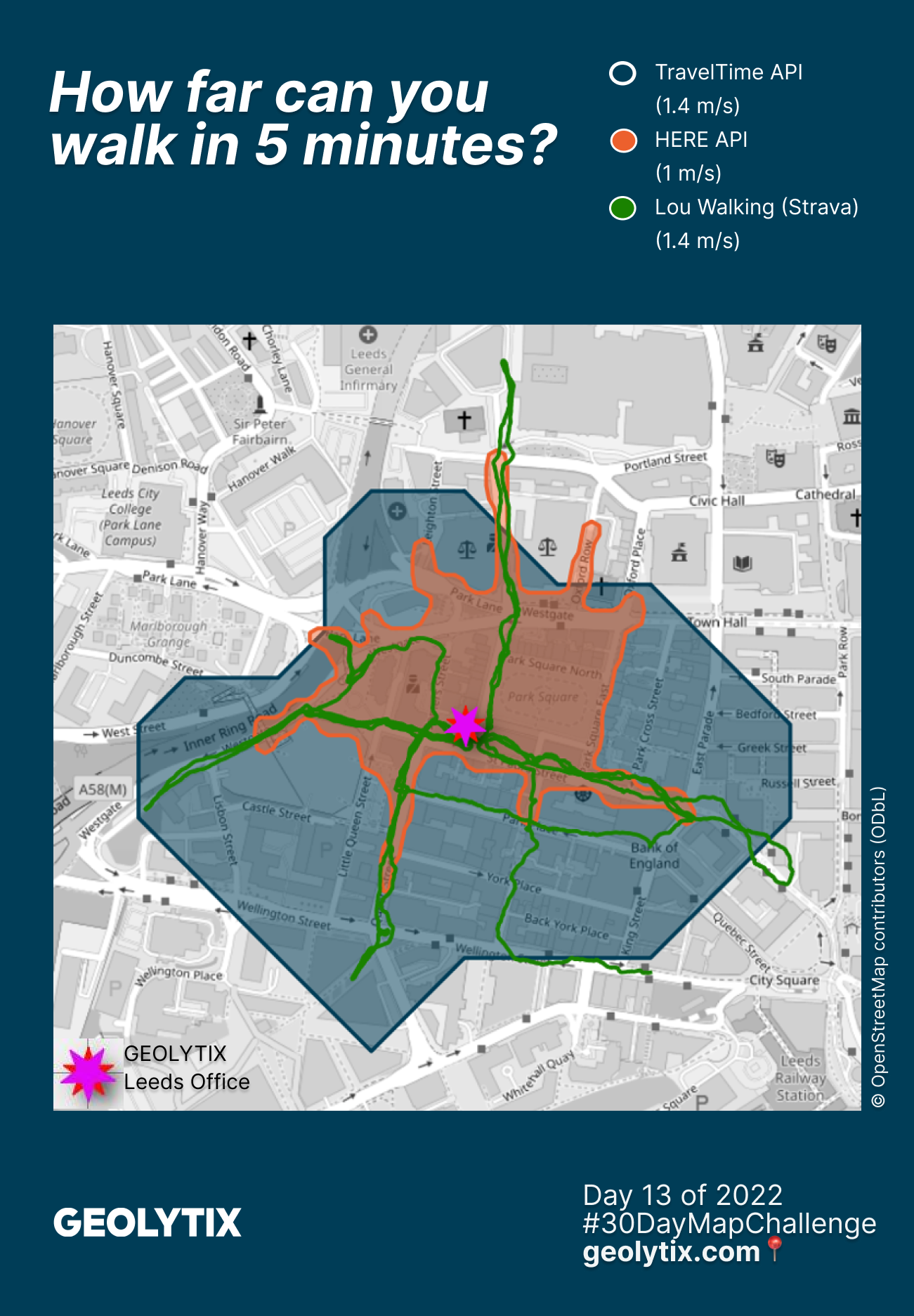 How far can you walk in 5 minutes? 5 minute walking from the Geolytix Leeds office using different sources