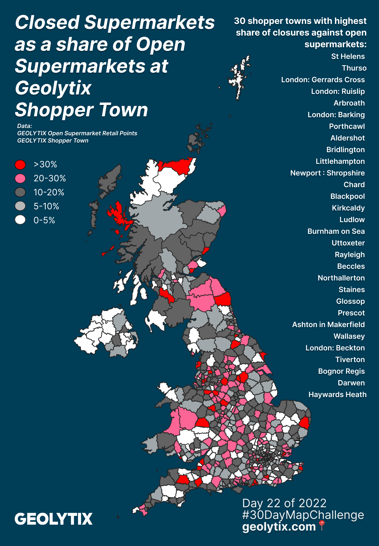 Closed Supermarkets as a share of Open Supermarkets at Geolytix Shopper Town