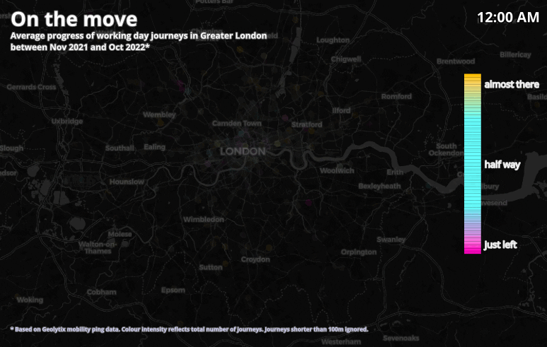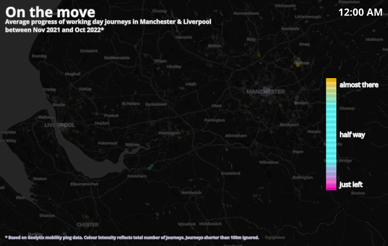 On the move... using mobility ping data to show average progress of working day journeys in various cities between November 2021 and October 2022