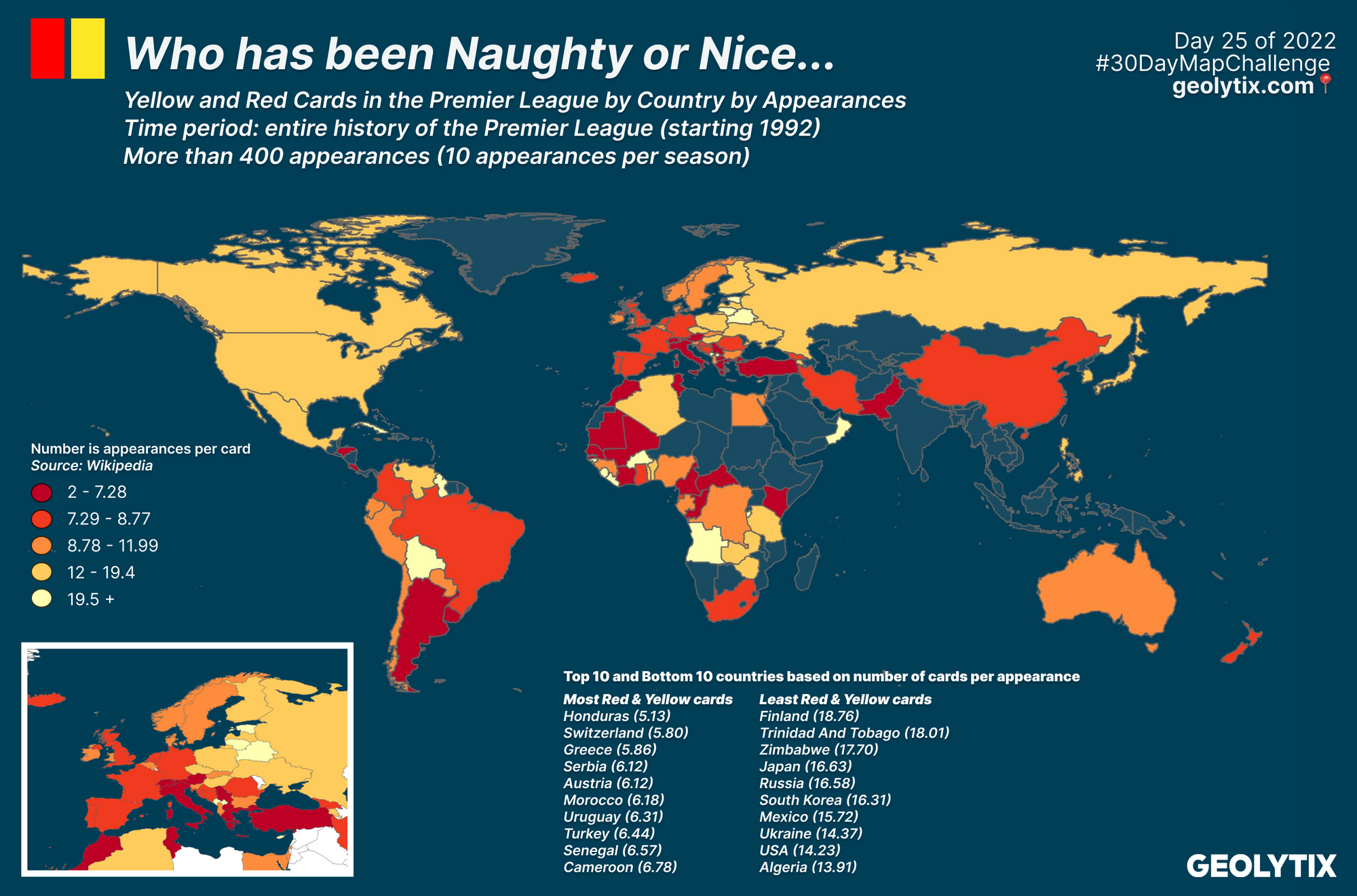 Yellow and Red Cards in the Premier League by Country by Appearances