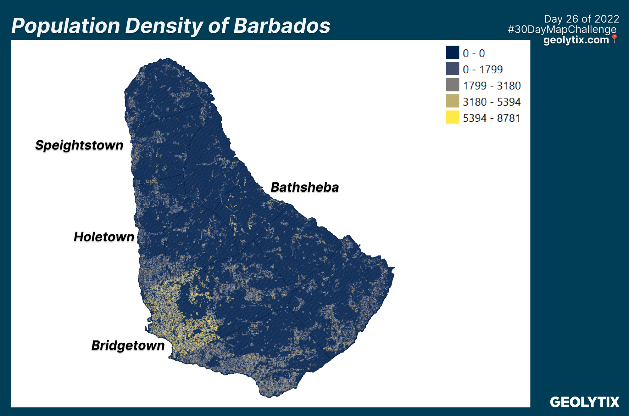 Population density of Barbados in the national colours (blue and gold). It became a Republic last year on 30th Nov 2021 (celebrating the first full year anniversary on Wednesday 30th Nov 2022). They are also the world's youngest republic