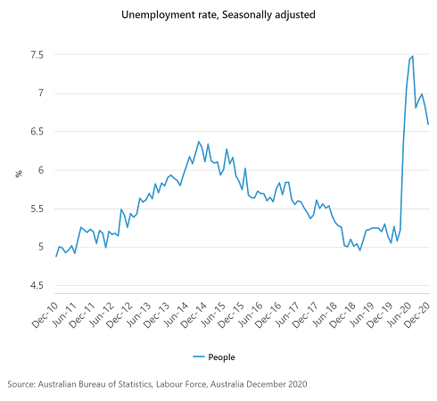 COVID has had a significant impact on unemployment in Australia. In January 2020, before the pandemic, the unemployment rate was 5.2%. Having reached a peak of 7.5% in August 2020 (during the height of the pandemic in Australia), it is now at 6.6%.