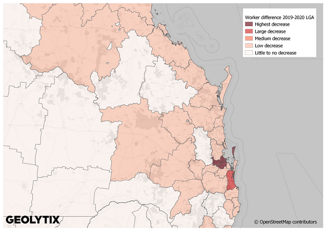 Thematic Map of QLD coast- showing changes in worker counts 2019-2020 by LGA
