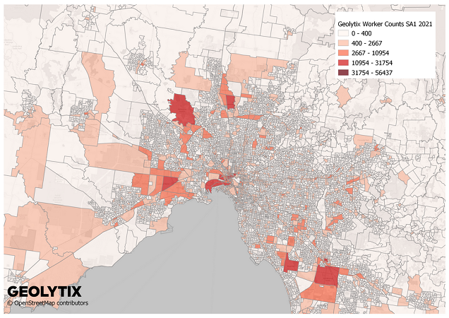 Example of Geolytix Worker Dataset (SA1 level), showing 2021 counts in Melbourne.