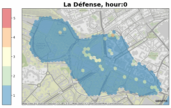 For Geolytix, Residential Sociodemographics and Mobility Data are important to understand the full picture of a location. Here is an example of business center La Défense near Paris that illustrates the estimated number of people per hour during an average day.