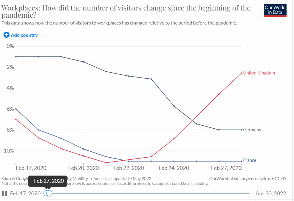 End of April, French employees went 13% less to their office compared to pre-Covid period. In the UK this is even more and reaches -18% while this is only -3% in Germany (Source: Google COVID-19 Community Mobility Trends).