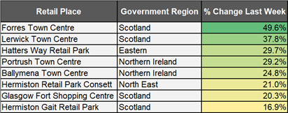 The picture is complex and dynamic. Looking at some of the biggest movers last week, we can see the effect of non-essential retail opening in Scotland, and school holidays in Northern Ireland. We can also see QSR-anchored Retail Park like Hatters Way in Luton, and Hermiston Retail Park in Consett start to motor.