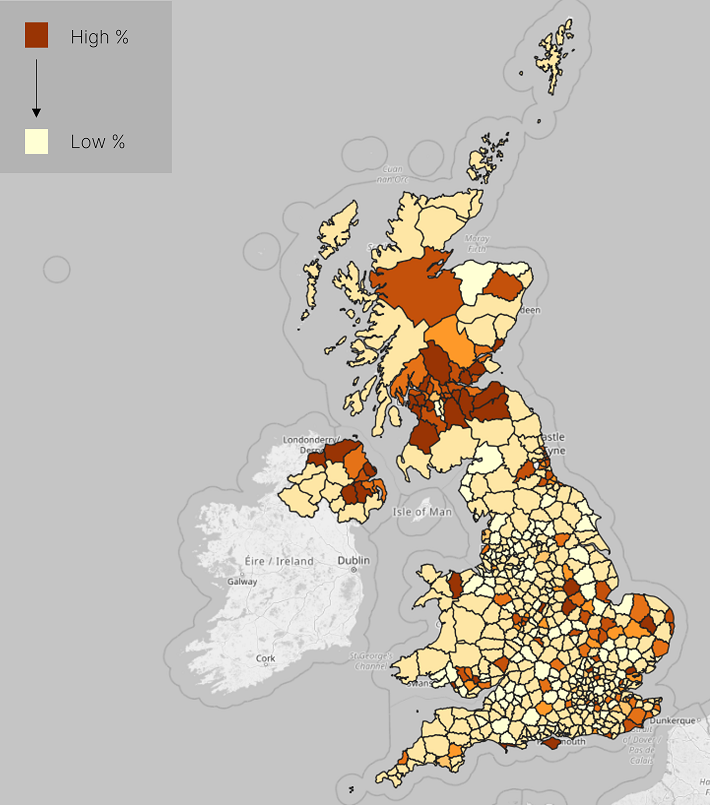 One last thing. Since I’m sure lots of us are headed to the seaside before summer is over, how about a Fish and Chips map (or rather, % of online takeaways which serve fish and chips):