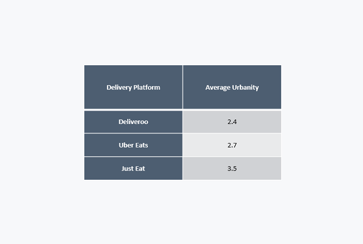 We can prove this using Geolytix’s urbanity scale. The average urbanity for a takeaway on Just Eat is indeed less urban than for Uber Eats or Deliveroo. Note an urbanity of 1 represents a very urban location, and 9 a very rural location: