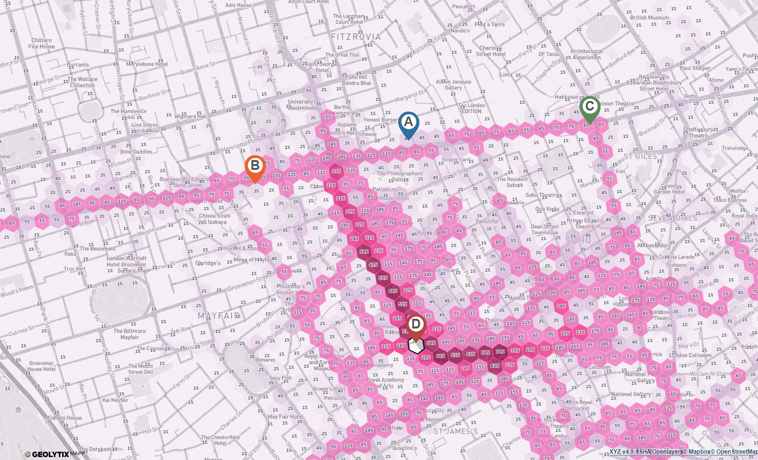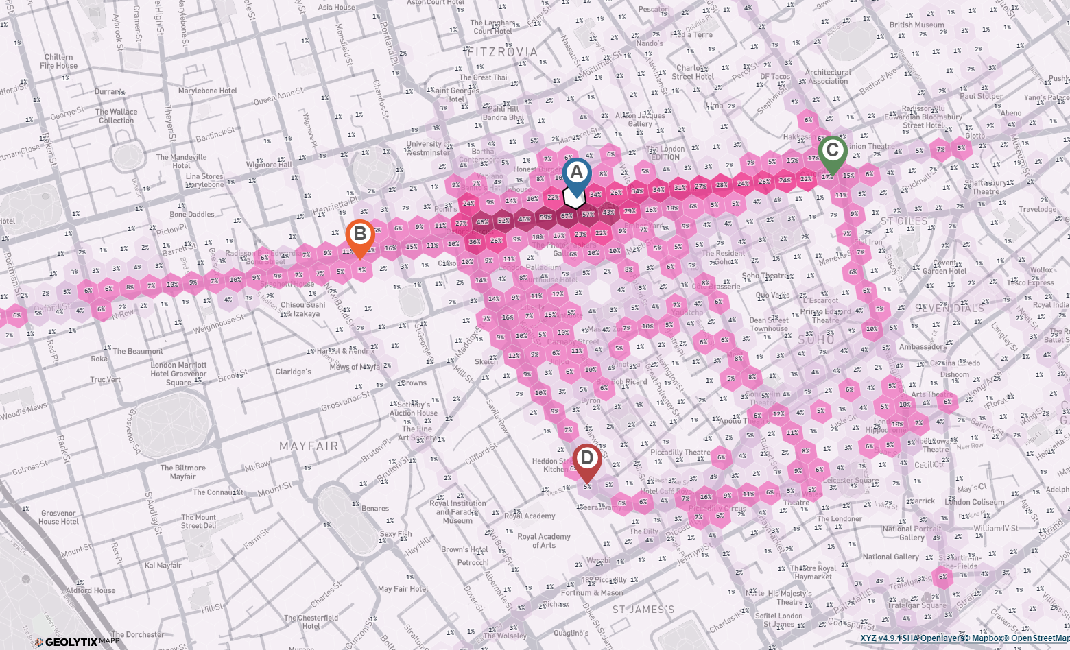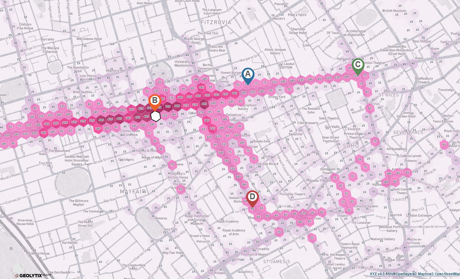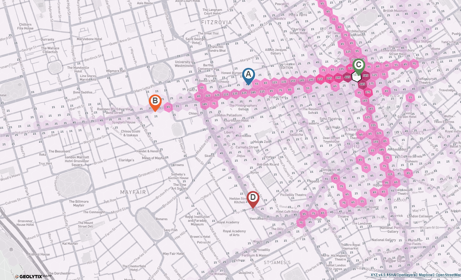 This gave me a good excuse to play with our Interaction Surfaces again – and we can see from the maps below that the 4 store strategy gives Uniqlo a really nice distribution with relatively low overlap between locations, despite their proximity to one another.