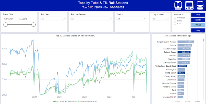 But that headline masks a massive shift between stations – back in 2019, Oxford Circus accounted for 50% of the taps, TCR 26%, and Bond St 24%. Fast forward 5 years and the Elizabeth Line, and TCR now leads the way with 40% of taps, Oxford Circus down at 34%, and Bond St pretty steady at 26%.