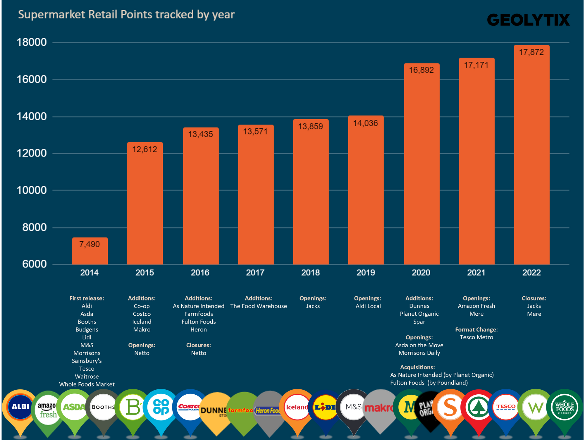 Our vision when we first released this data set in 2014 was to collate, maintain and deliver a structured one stop shop file, unintentional but suitable pun, of the UK grocery market by collating supermarket and convenience store locations including full addresses with accurate rooftop coordinates. The concept still to this day is to publish an industry acknowledged product without restrictions that is utilised by retailers, interested parties and the public. The continual success of our goal has allowed us to enhance and expand the list of retailers and fascia we track. We haven’t seen this many retailers in one place since the #Aldi30thBirthdayParty in 2020.